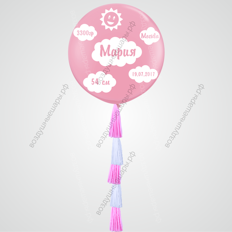 ПОДСКАЗКА: кликните по шарикам с плюсиками "Добавьте к вашему товару" и закажите к композиции из шариков Большой гелиевый шар "Родилась девочка!", 90 см с гирляндой тассел топпинги: Бант из широкой ленты 50 мм для шаров, Ваша индивидуальная надпись на большой латексный шар 80 см., Шары Светло- розовые с гелием. Они добавят ей своеобразия и придадут законченный вид! И за каждый топпинг вы получите :дополнительную скидку: на сам товар!