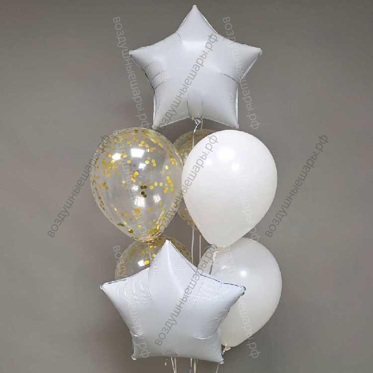 Букетик "Белое золото" с конфетти и звездами, .- это напольная или настольная композиция из шариков, высотой от одного и до двух метров (см. Свойства товара). Она не тяжелая и легко перемещается с места на место.
