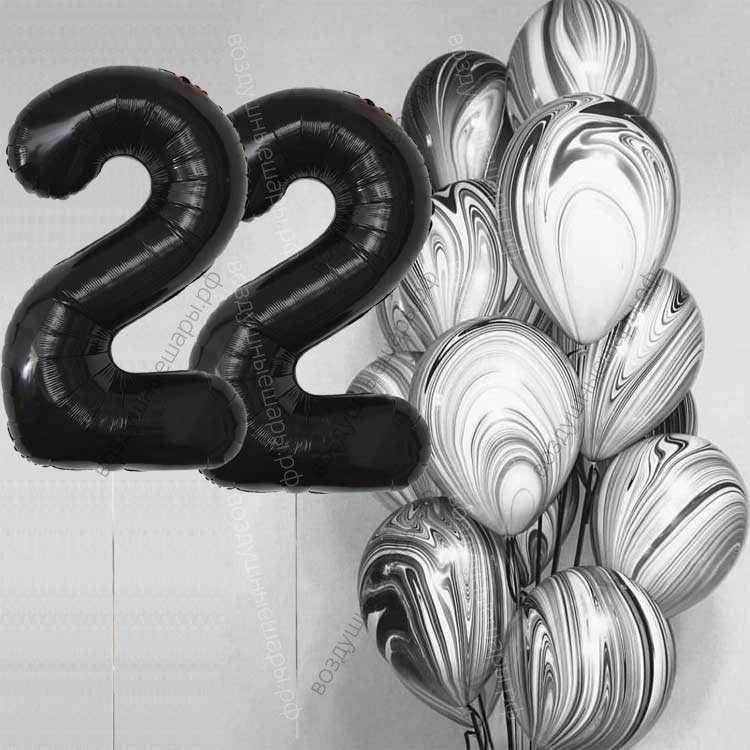 Букет гелиевых шаров агатов на 22 года Безупречный стиль с черными цифрами, 12шаров+2черные цифры