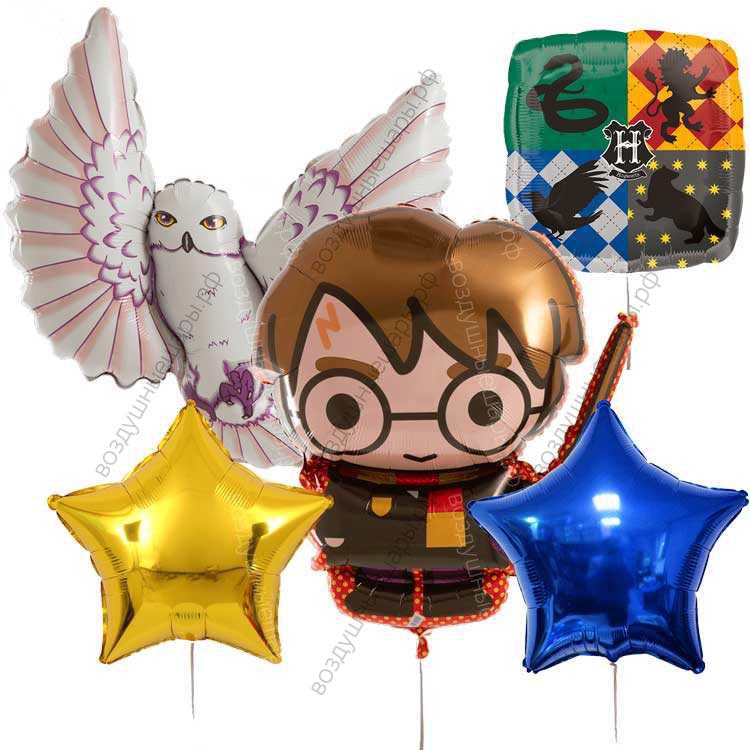 Букет гелиевых шаров "Белая сова Букля и Гарри Поттер", 2 звезды, 3 фигуры