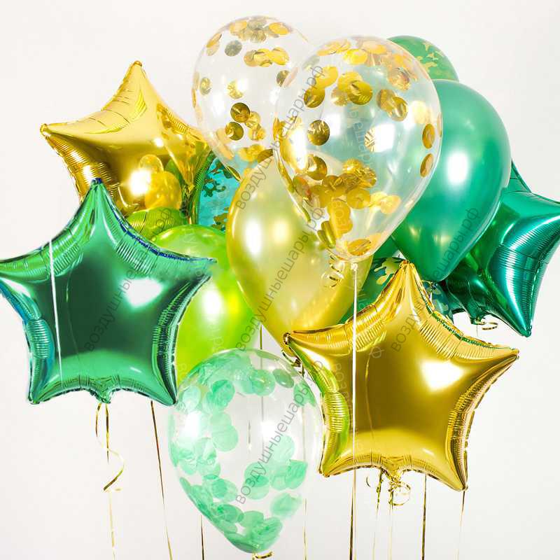 Букет гелиевых шаров "Изумрудный микс" с зелеными и золотыми звездами, 10 шаров + 4 звезды характеристики: