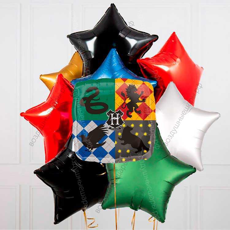 Закажите Букет гелиевых звезд в стиле Гарри Поттер с шаром "Факультеты школы Хогвартс" недорого с доставкой по Москве прямо сейчас!