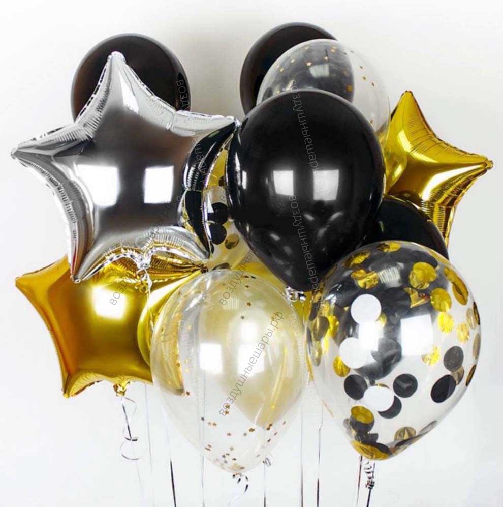 Закажите Букет из черно-золотых гелиевых шаров "Триумф" из 11 шаров + 3 звезды недорого с доставкой по Москве прямо сейчас!