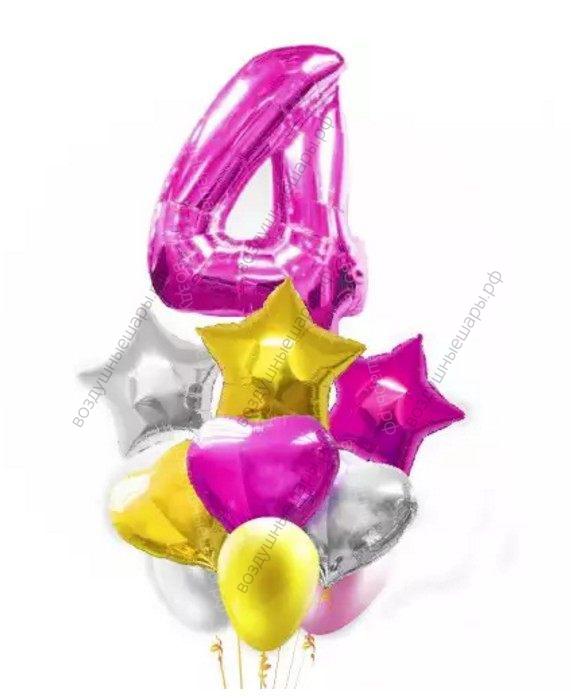 Закажите Букетик Серебристо-малиново-золотой с цифрой, 3 шара, 3 сердца, 3 звезды и цифра на выбор недорого с доставкой по Москве прямо сейчас!