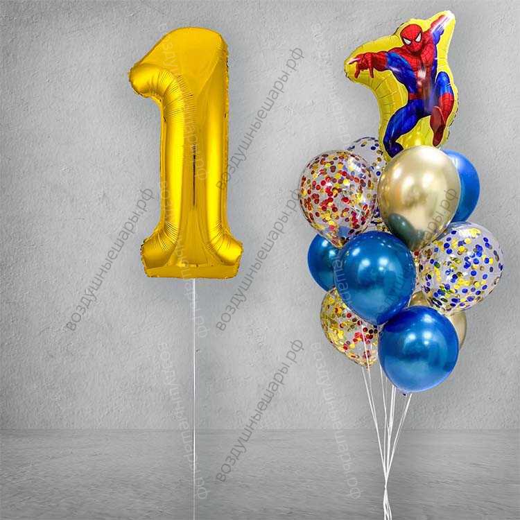 Закажите Композиция шаров на 1 год ребенку "Человек-паук желтый", .12 шаров и золотая цифра недорого с доставкой по Москве прямо сейчас!