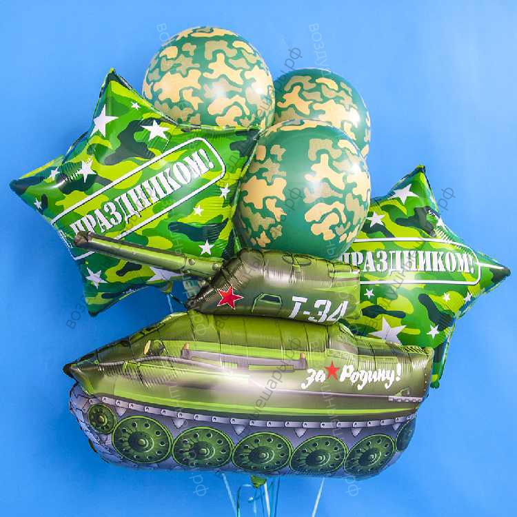 Букет шаров с гелием на 23 февраля "Танк Т-34", 6 шаров+фигура из воздушных шаров это милый подарок и очаровательное украшение для вашего праздника!