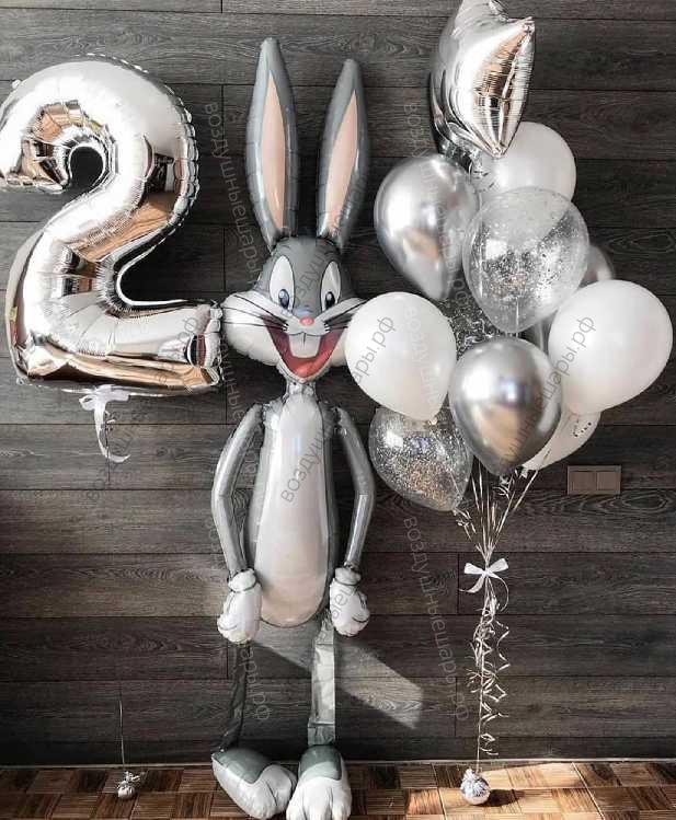 Закажите Фонтан из серебристых шаров "Зайке 2 года" для ребенка, 11 шаров + цифра + фигура недорого с доставкой по Москве прямо сейчас!