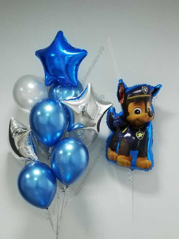 Фонтан сине-серебристых шаров с Чейзом, 7 шаров+3 звезды+фигура Щенячьего патруля