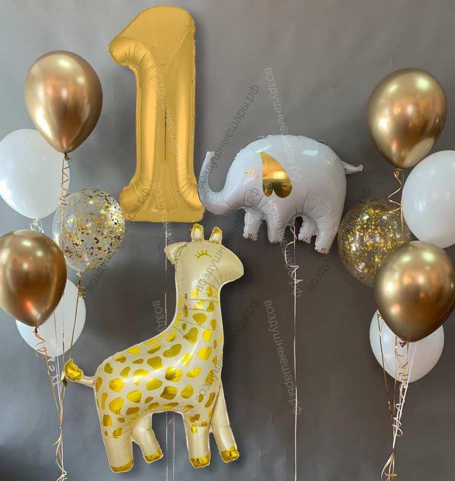 Закажите Фотозона из гелиевых шаров "Жираф и слоник" на годик ребенку, 2 букета по 5 шаров, цифра и 2 фигуры недорого с доставкой по Москве прямо сейчас!