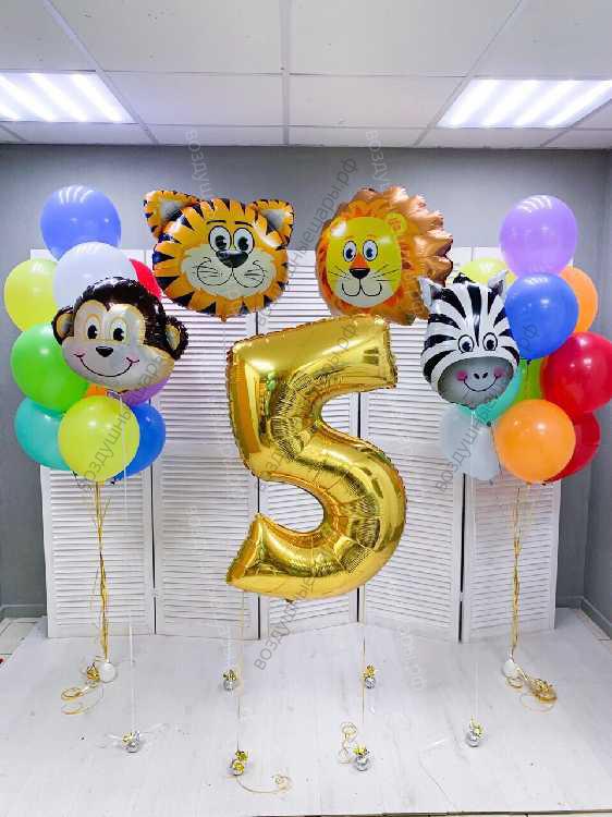 Закажите Фотозона из разноцветных шаров "Зверята" на детский день рождения, 20 шаров+цифра+4 фигуры недорого с доставкой по Москве прямо сейчас!