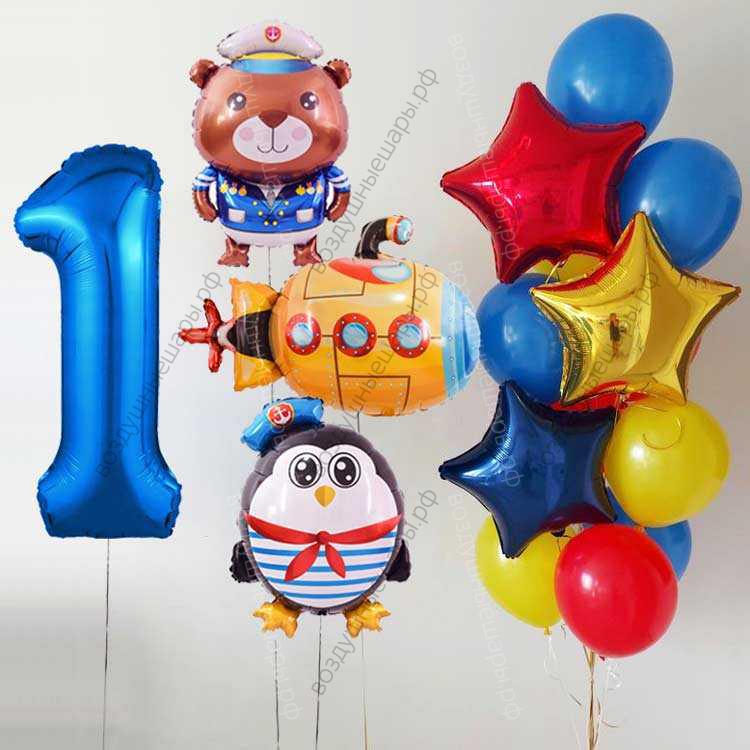 Закажите Фотозона на 1 годик с Мишкой, Пингвином и Подводной лодкой , 13 шаров и 3 фигуры недорого с доставкой по Москве прямо сейчас!