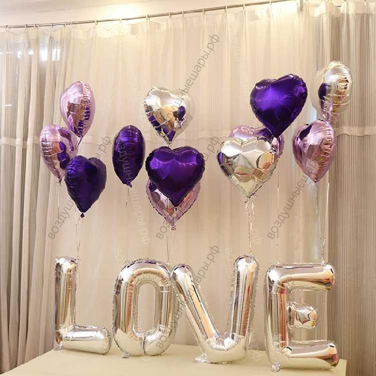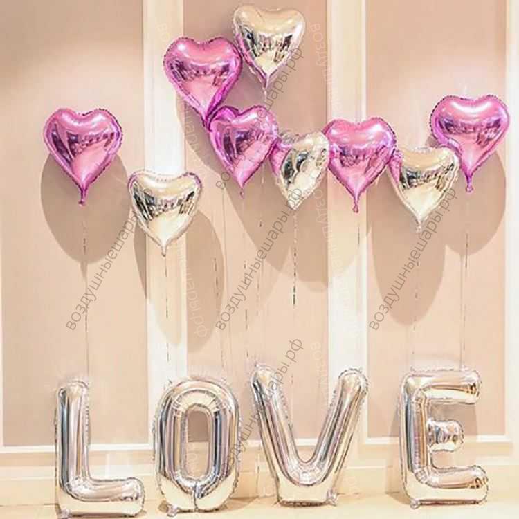 Воздушные шары на 14 февраля, День Влюбленных, 4 больших буквы и 12 сердец