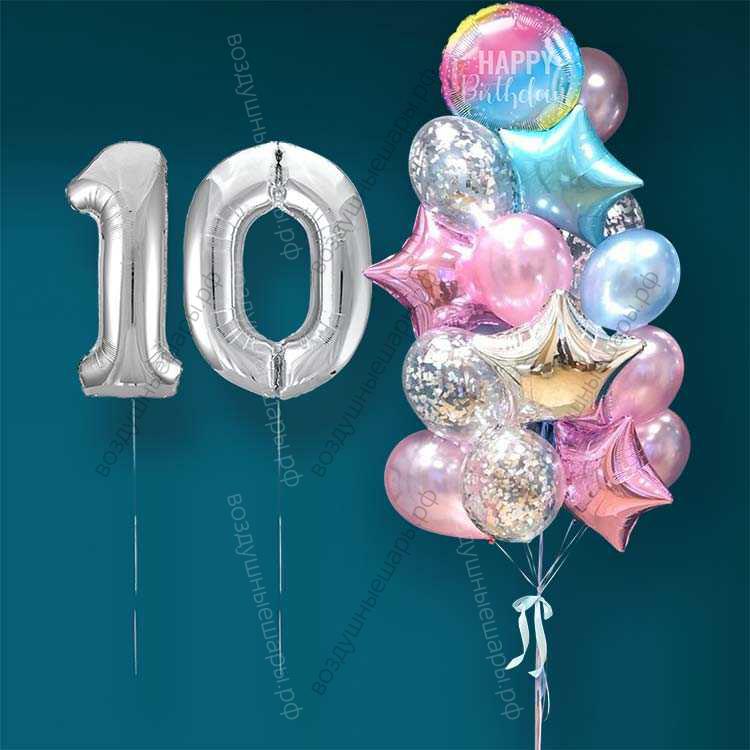 Гелиевые шарики на 10 лет девочке "Розово-голубое мерцание", 20 шаров и серебристые цифры характеристики: