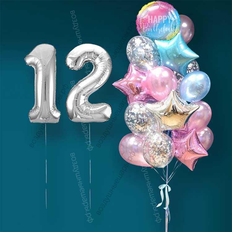 Закажите Гелиевые шарики на 12 лет девочке "Розово-голубое мерцание", 20 шаров и серебристые цифры, . недорого с доставкой по Москве прямо сейчас!