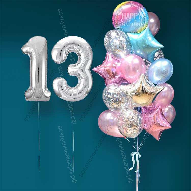Закажите Гелиевые шарики на 13 лет девочке "Розово-голубое мерцание", 20 шаров и серебристые цифры, . недорого с доставкой по Москве прямо сейчас!