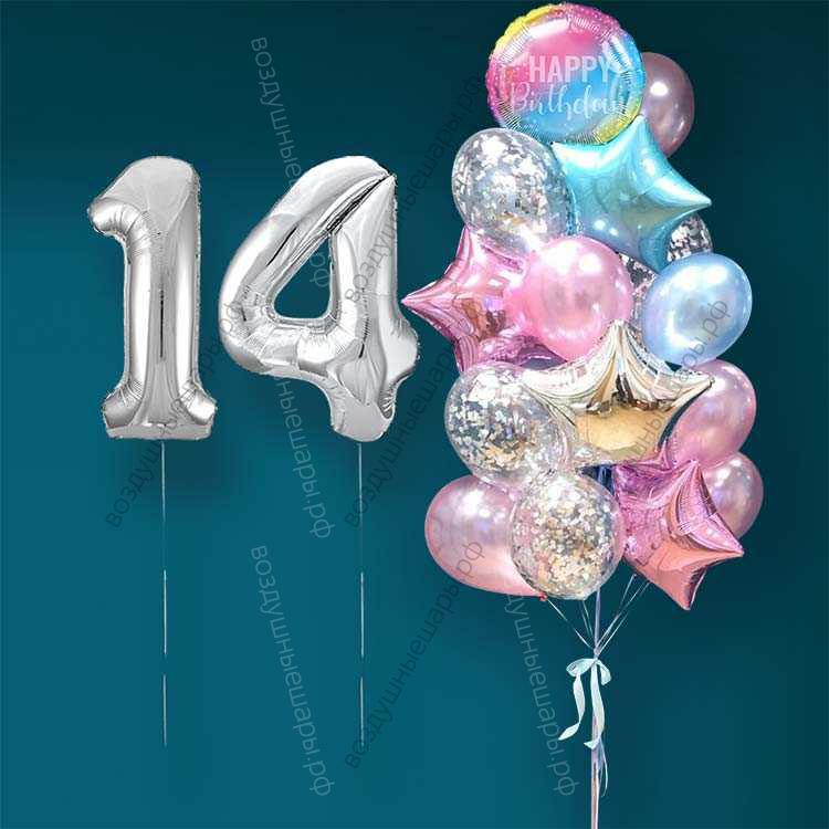 Закажите Гелиевые шарики на 14 лет девушке "Розово-голубое мерцание", 20 шаров и серебристые цифры, . недорого с доставкой по Москве прямо сейчас!