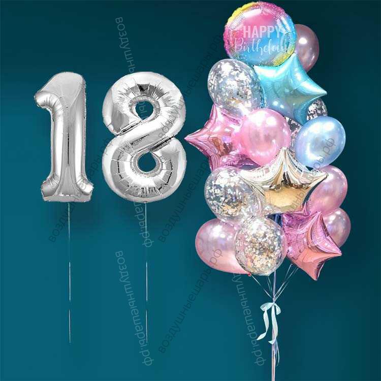 Гелиевые шарики на 18 лет девушке "Розово-голубое мерцание", 20 шаров и серебристые цифры характеристики: