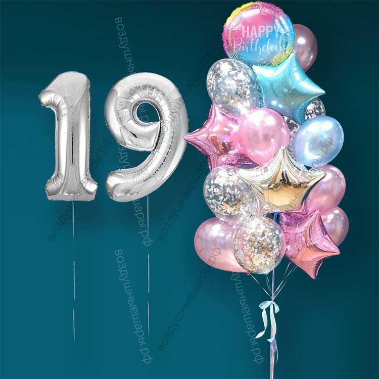 Гелиевые шарики на 19 лет девушке "Розово-голубое мерцание", 20 шаров и серебристые цифры характеристики: