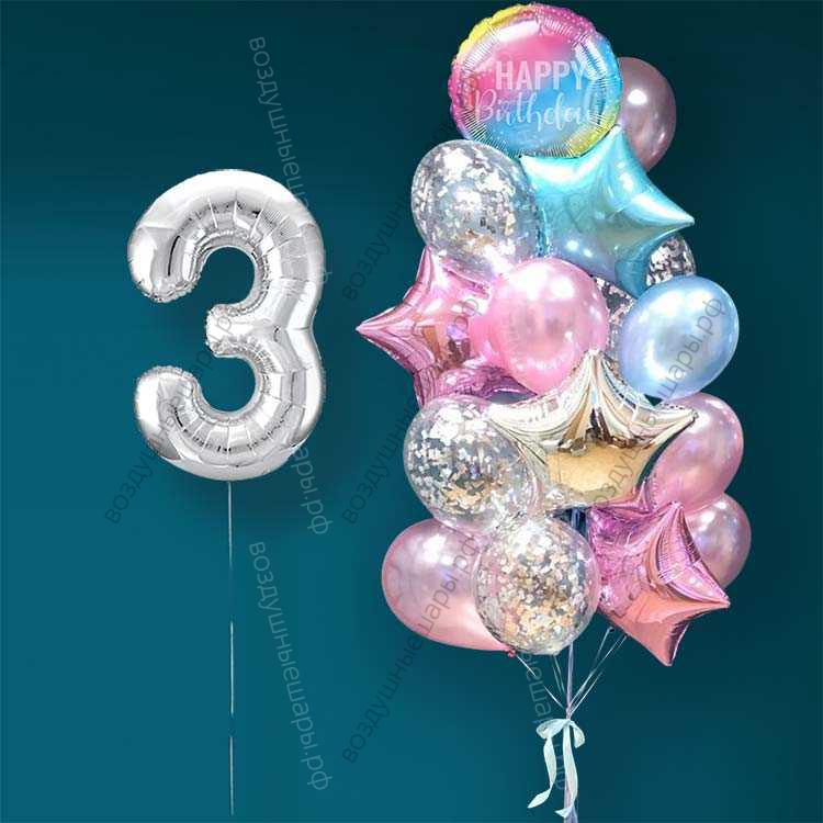 Гелиевые шарики на 3 года девочке "Розово-голубое мерцание", 20 шаров и серебристая цифра характеристики:
