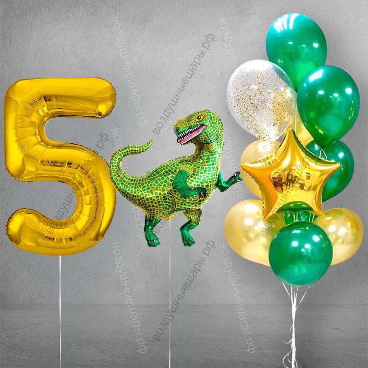 Закажите Шары с гелием на 5 лет ребенку "Оформление шарми с Тиранозавром", 12 шаров и золотая цифра недорого с доставкой по Москве прямо сейчас!