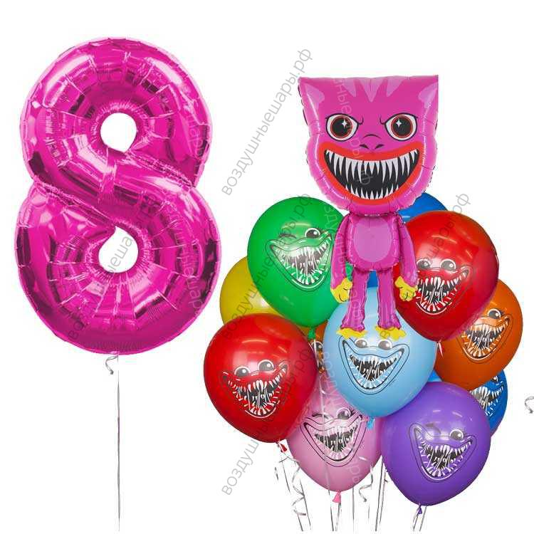 Закажите Композиция из гелиевых шариков с Киси Миси, на 8 лет, 16 шт, малиновая цифра и Зубастик недорого с доставкой по Москве прямо сейчас!