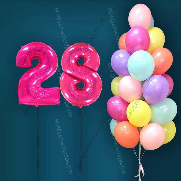 Гелиевые шары на 28 лет для женщины "Акварельный этюд", 25 шариков и малиновые цифры характеристики: