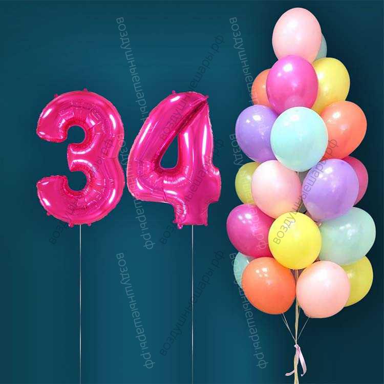 Гелиевые шары на 34 года для женщины "Акварельный этюд", 25 шариков и малиновые цифры характеристики: