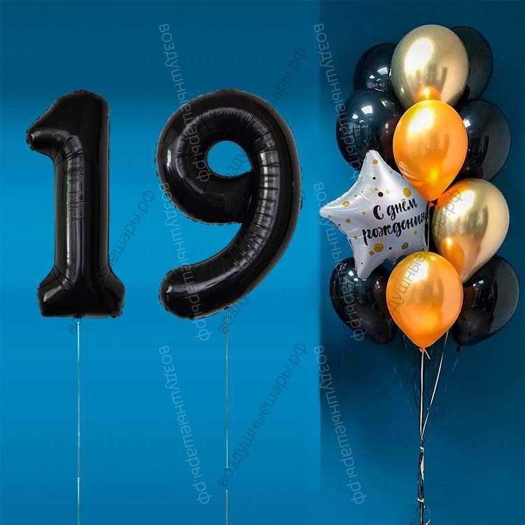 Закажите Комплект шаров с черными цифрами на 19 лет Элит, 12шаров+2черные цифры недорого с доставкой по Москве прямо сейчас!