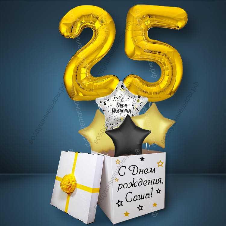 Коробка с шарами на День Рождения 25 лет, со звездами и золотыми цифрами, .