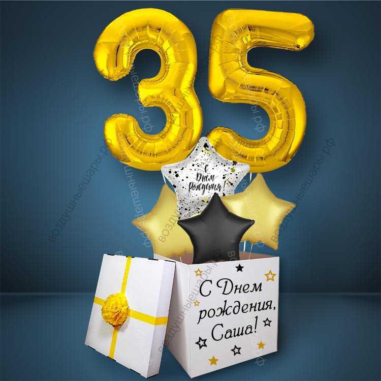 Закажите Коробка с шарами на День Рождения 35 лет, со звездами и золотыми цифрами с доставкой по Москве недорого или с самовывозом прямо сейчас. Звоните!
