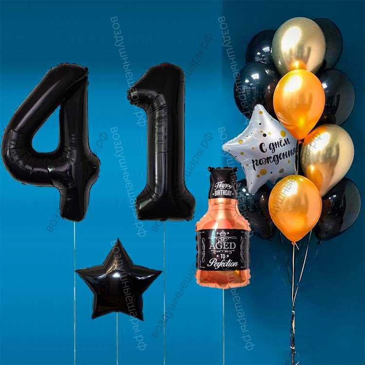 Закажите Оформление шарами на 41 год с бутылкой виски и черными цифрами Black Label, 2цифры,бутылка,звезда,12шаров недорого с доставкой по Москве прямо сейчас!