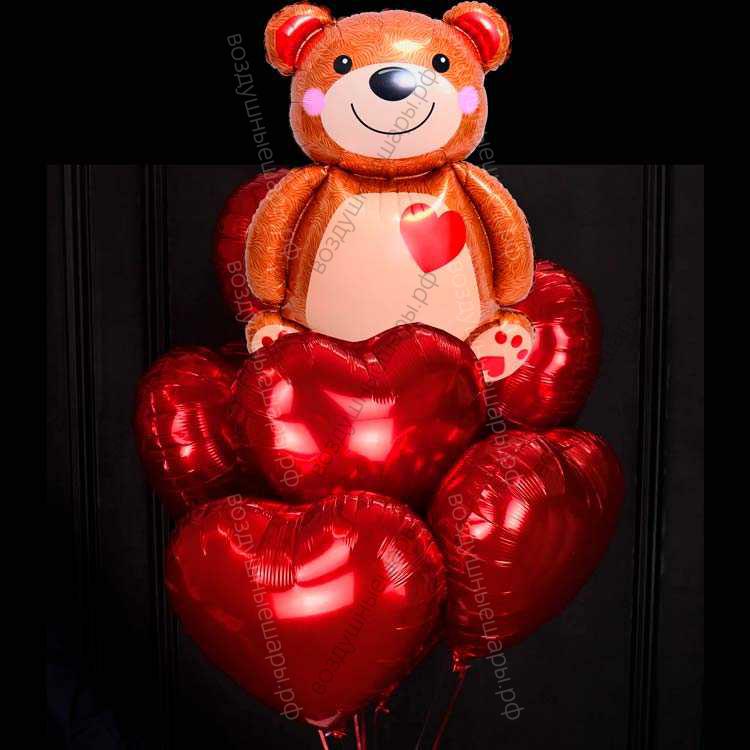 Подарок из шаров для любимой на 14 февраля, Мишка с сердцами, 7 фольгированных сердец + фигура
