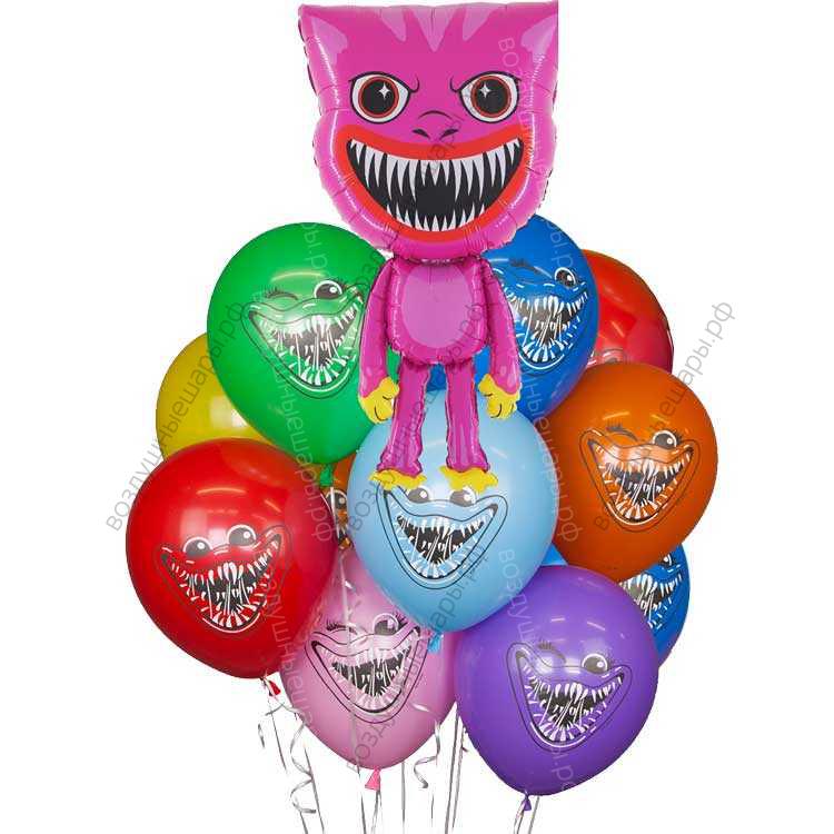 Подарок из шаров для ребенка Зубастики, Кисси Мисси - это запоминающееся украшение на праздник и хороший подарок для почитателей героев этого мультфильма или игры!