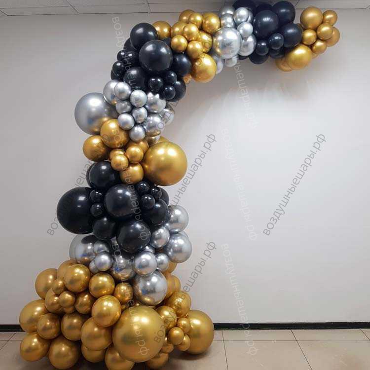 Полуарка золото- серебро- черная разноразмерная можно использовать как внутри помещения, так и на улице..
