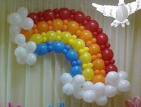 Дети очень любят играть с фигурами из воздушных шаров, а для взрослого человека Радуга в облачках из шариков станет нарядным подарком на праздник.