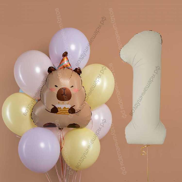 Сет Капибара с тортом, шарами макарунс на 1 годик, 14 гелиевых шариков, фигура и цифра