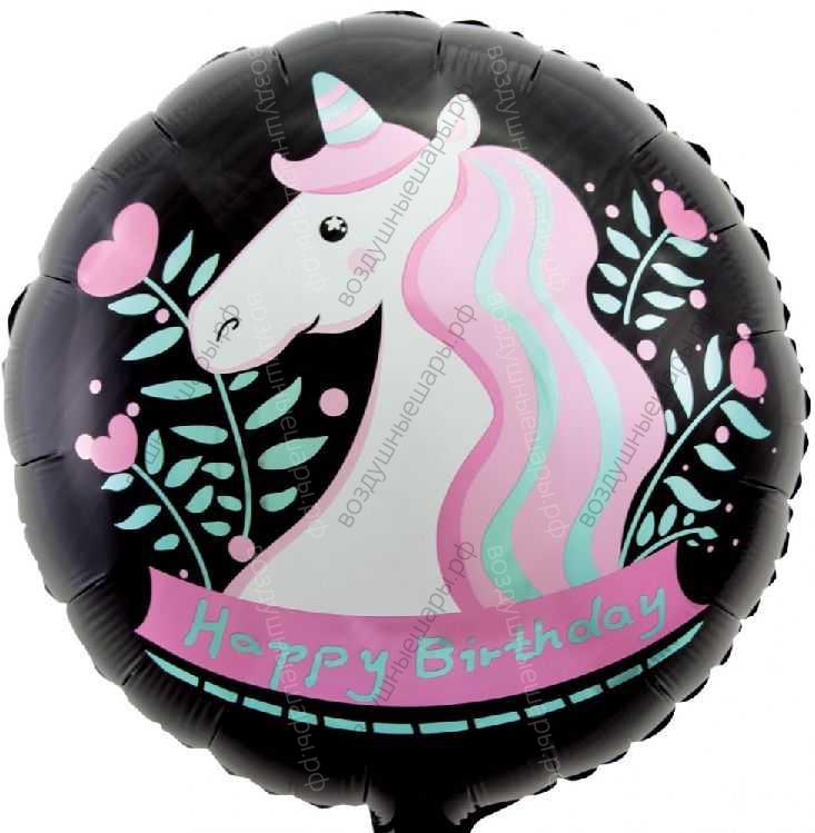 Шар с гелием Круг, С Днем Рождения , единорог, Черный, 46 см. характеристики: