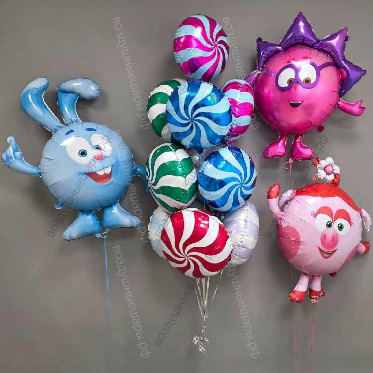Закажите Шарики Смешарики Крош, Нюша, Ежик и букет леденцов недорого с доставкой по Москве прямо сейчас!