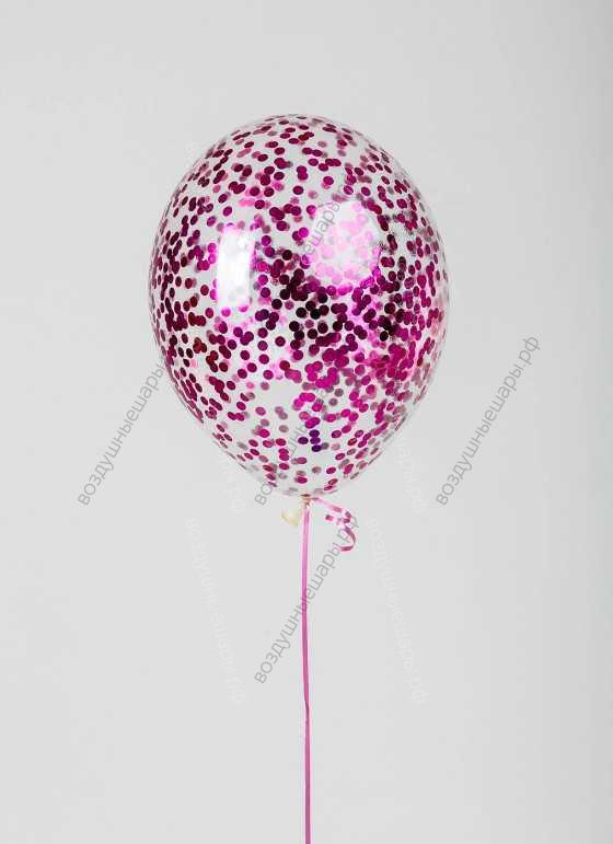 Шарик с малиновым конфетти внутри (круги фуше) с гелием 30 см. - это прозрачный латексный шар размером от 25 до 35см (см. Свойства товара). Он надут гелием и летает, а внутри него находится конфетти из бумаги или фольгированной пленки (шар с блестками). Благодаря этому шары с конфетти выглядят очень ярко и креативно.