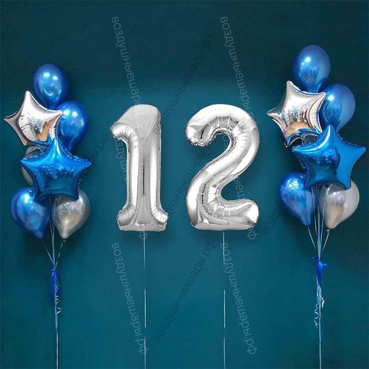 Шары на 12 лет мальчику, сет "Серебристо-синий", 14 шариков с гелием и цифры характеристики: