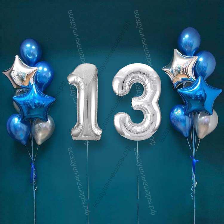 Шары на 13 лет мальчику, сет "Серебристо-синий", 14 шариков с гелием и цифры характеристики: