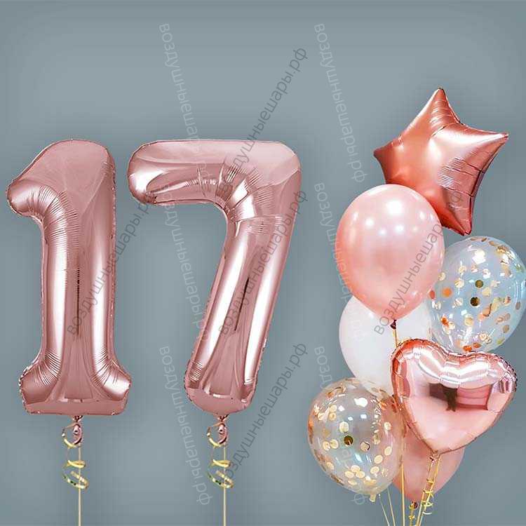 Шары на 17 лет девушке, сет "Розовое золото", 7 шариков с гелием и цифры характеристики: