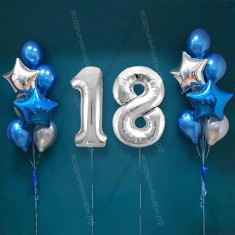 Шары на 18 лет парню, сет "Серебристо-синий", 14 шариков с гелием и цифры характеристики: