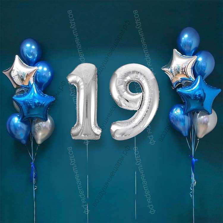 Шары на 19 лет парню, сет "Серебристо-синий", 14 шариков с гелием и цифры характеристики: