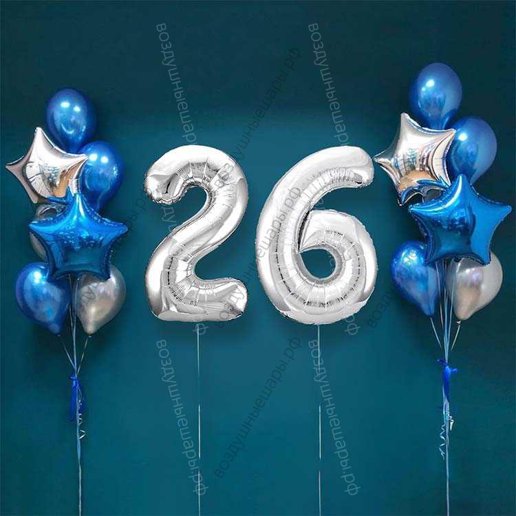 Закажите Шары на 26 лет мужчине, сет "Серебристо-синий", 14 шариков с гелием и цифры, . недорого с доставкой по Москве прямо сейчас!