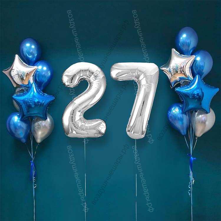 Шары на 27 лет мужчине, сет "Серебристо-синий", 14 шариков с гелием и цифры характеристики: