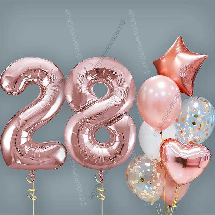 Шары на 28 лет женщине, сет "Розовое золото", 7 шариков с гелием и цифры характеристики: