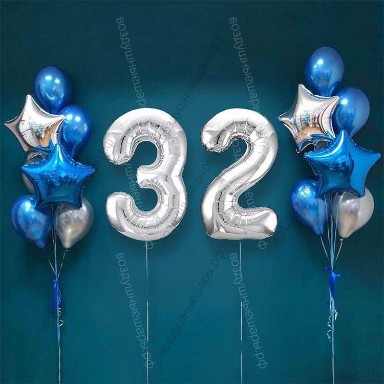 Закажите Шары на 32 года мужчине, сет "Серебристо-синий", 14 шариков с гелием и цифры, . недорого с доставкой по Москве прямо сейчас!