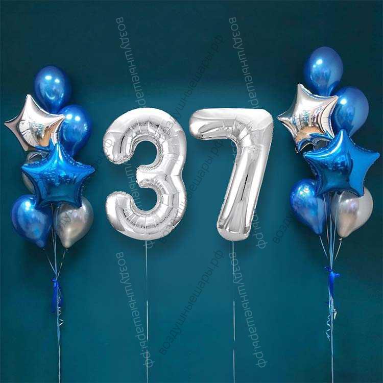 Шары на 37 лет мужчине, сет "Серебристо-синий", 14 шариков с гелием и цифры характеристики: