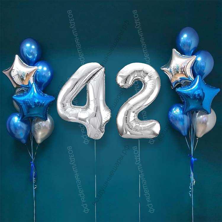 Закажите Шары на 42 года мужчине, сет "Серебристо-синий", 14 шариков с гелием и цифры, . недорого с доставкой по Москве прямо сейчас!